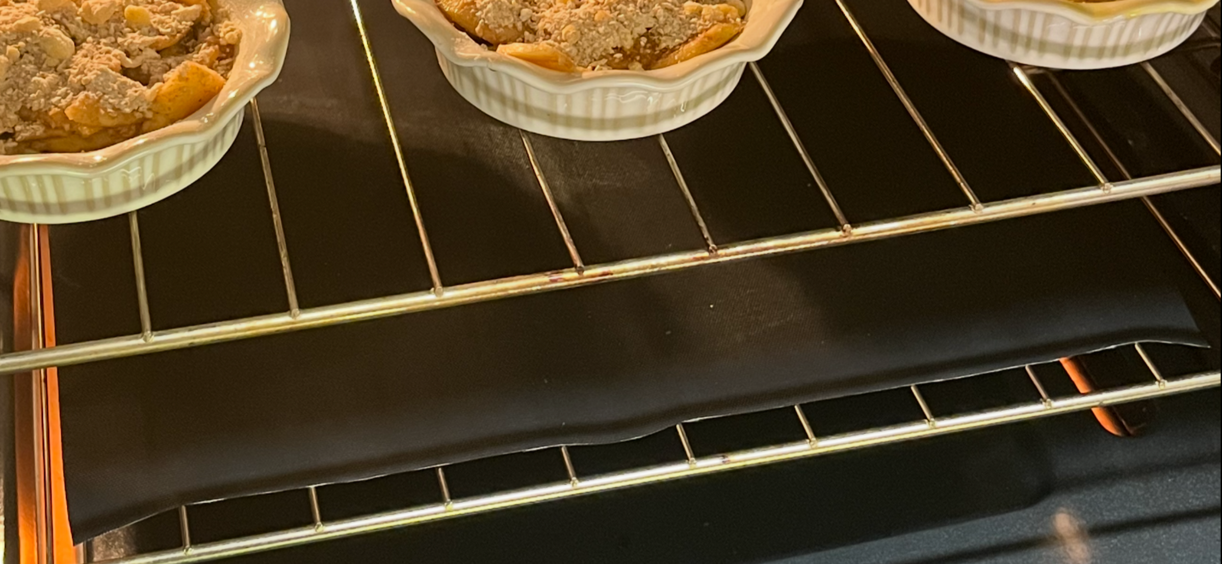 I purchased oven liners from amazon to make spills ten times easier to clean up. This time it was on my lower rack but you can place it on the very bottom too. Wipe down the liner or use a new one. Either way, mess free ovens, no more hurting your back to scrape off the mess from the bottom :)